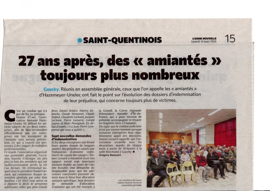 C'est dans la salle Marchand de Gauchy que l'association Amiante Hazemeyer-Unelec a tenu mardi soir son assemblée générale. Une fois de plus, ce rendez-vous a été parfaitement respecté par environ 120 personnes, ce qui représente plus de 20% des 550 membres de l'association.